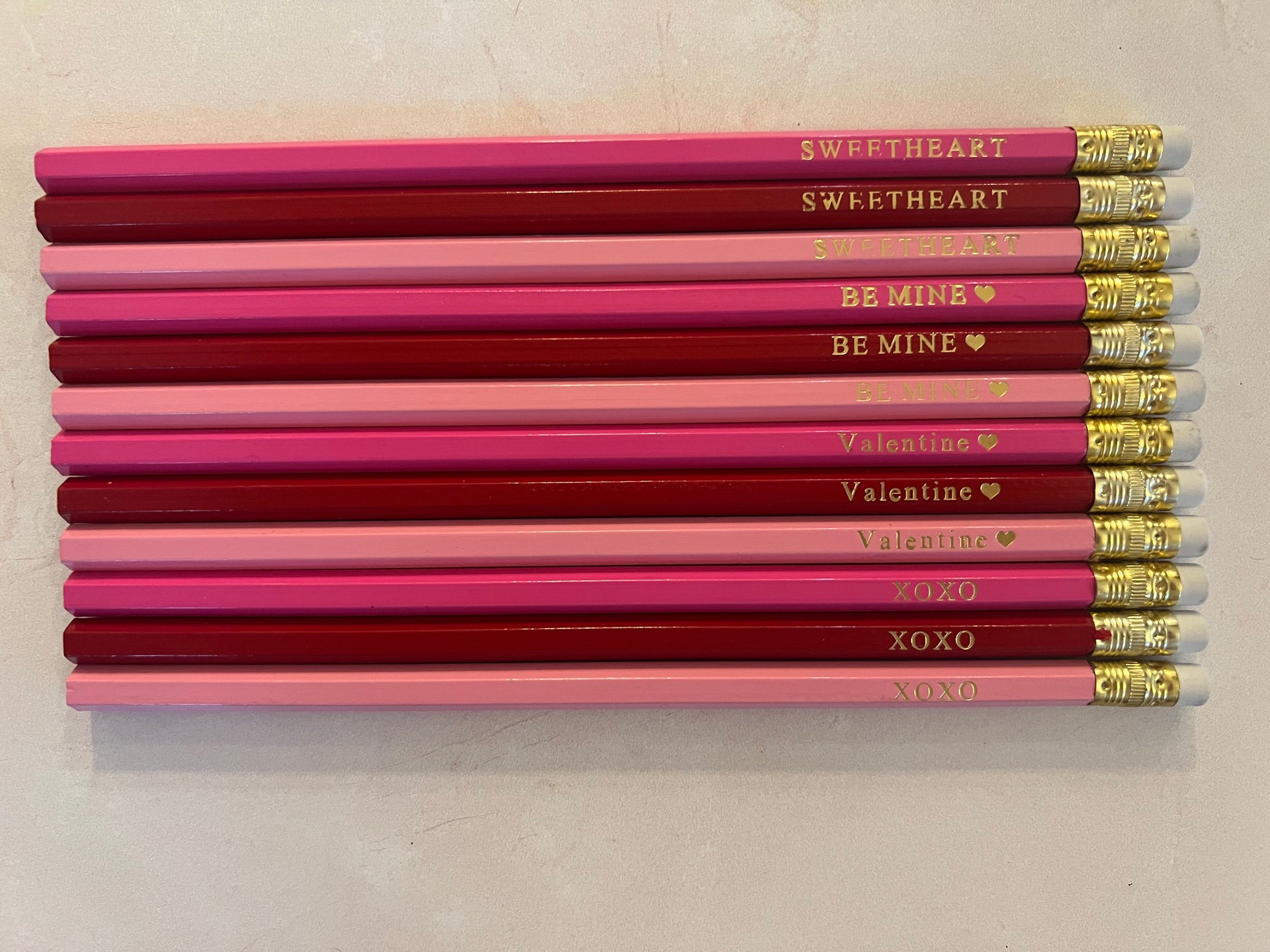 Perfect for your childs class valentine exchange! 12 Custom Valentines Greeting Pencils. 12 Pencils, with 4 different candy heart greetings. 1. XOXO 2. Sweetheart 3. Be Mine <3 4. Valentine <3. Pencils are unsharpened and 3 valentine colors.